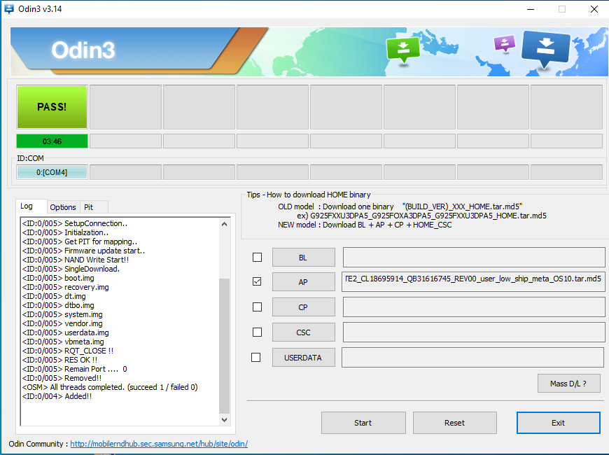 Zeigt Odin nach dem Flashen das grüne „Pass“, dann hat es funktioniert und das Samsung Galaxy A20e ist gerootet!